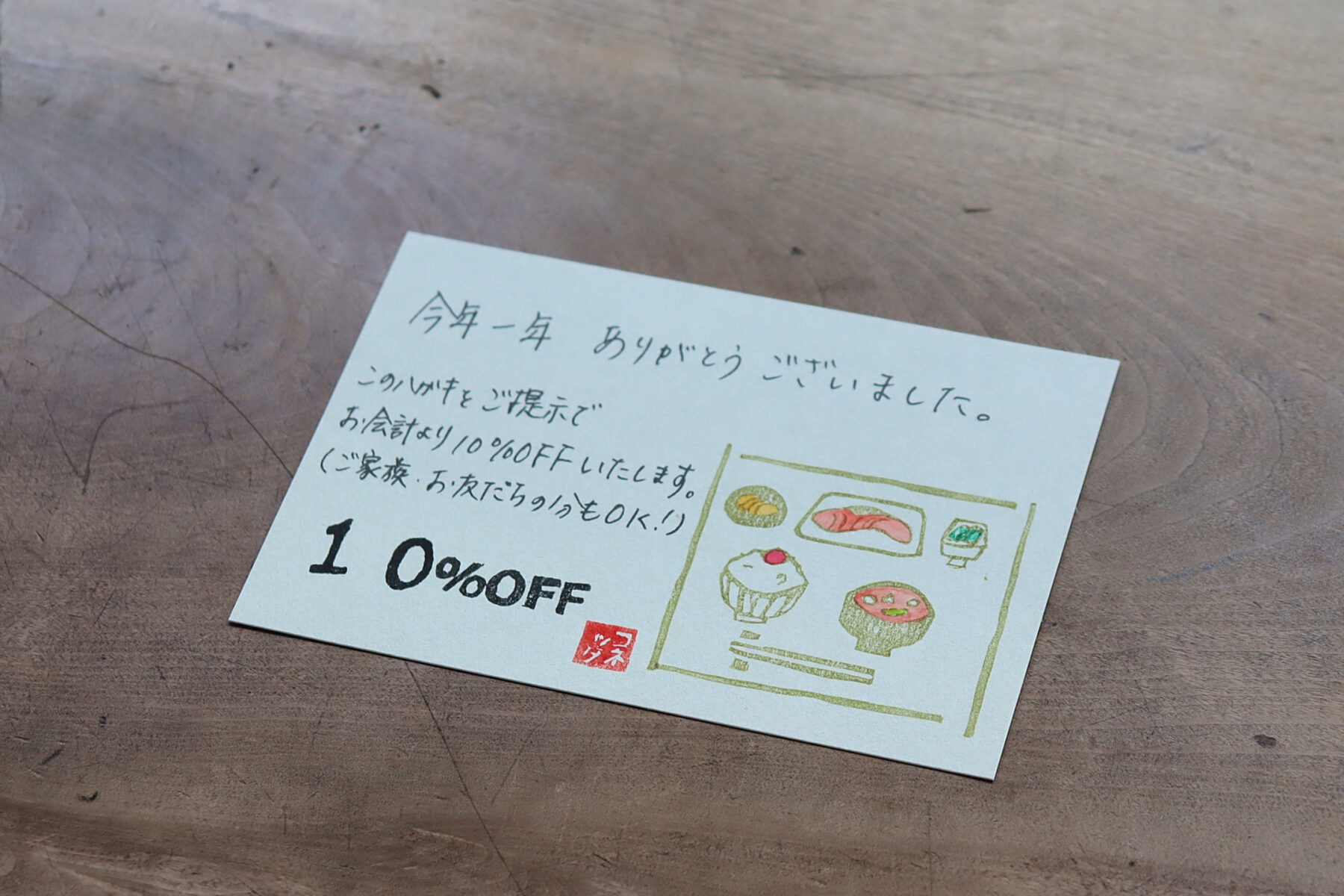 こちらのお葉書は、店内すべてのお会計にご利用可能です。その日一日であれば何度でも、お連れの方の分も割引対象となります。
